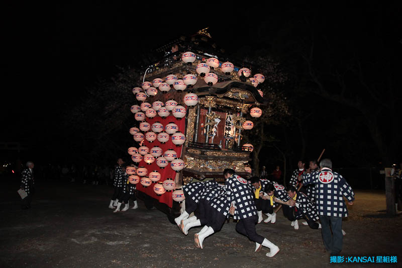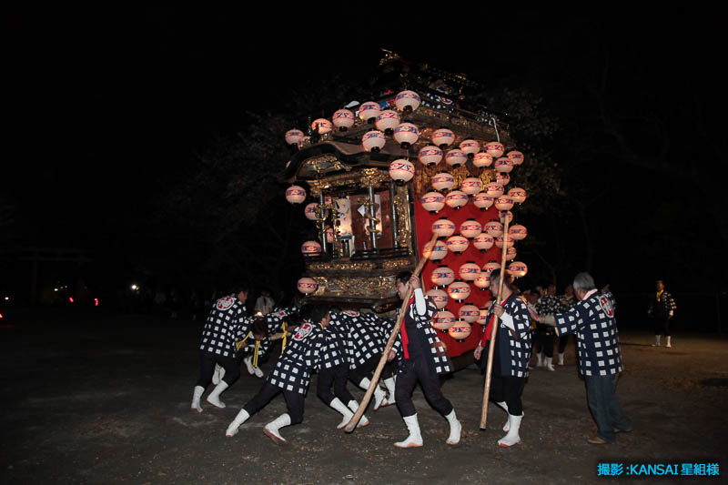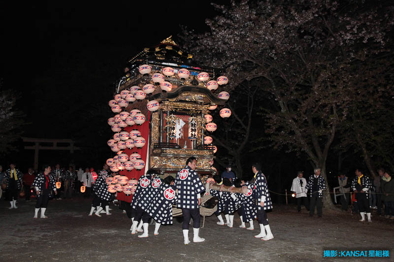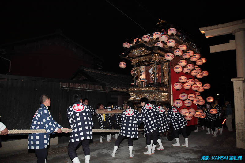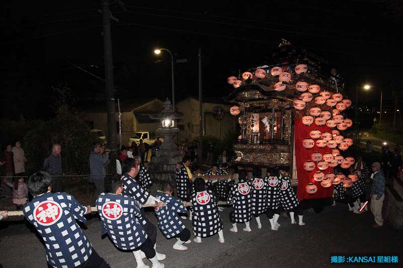 午後7時25分曳き廻しを終え神社の坂を戻る花王車です