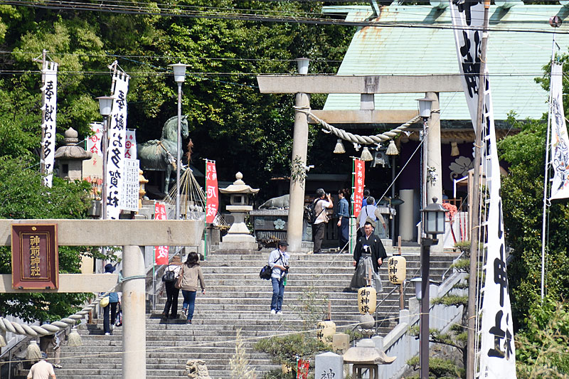 浜の堤防から望遠レンズで覗くと県社(神前神社)も手に取るように見えます