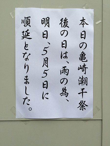 まだ夜が明けない頃、いつものように自宅から亀崎に向かう途中で「順延だよ」という連絡が入りましたが、想定内のことでして.