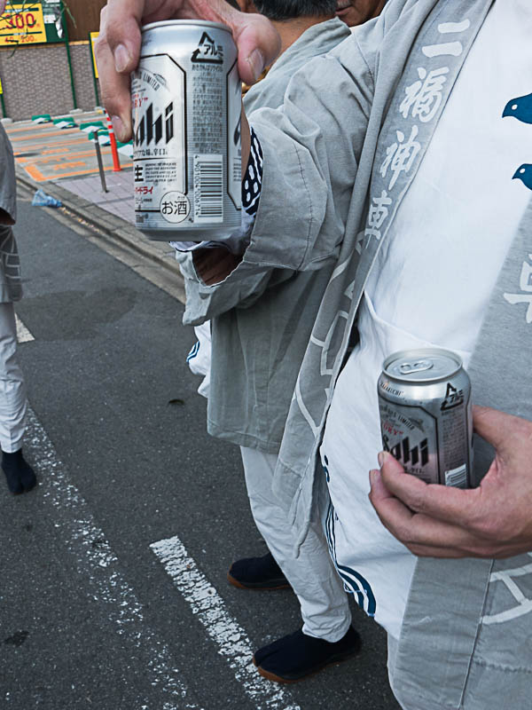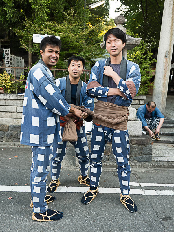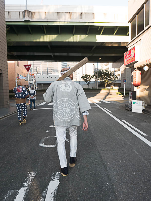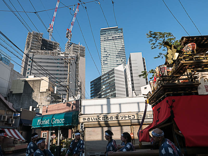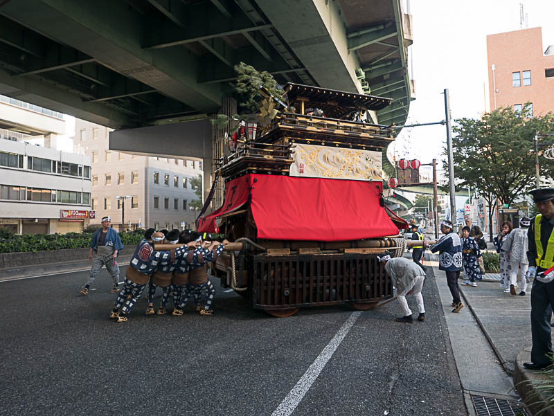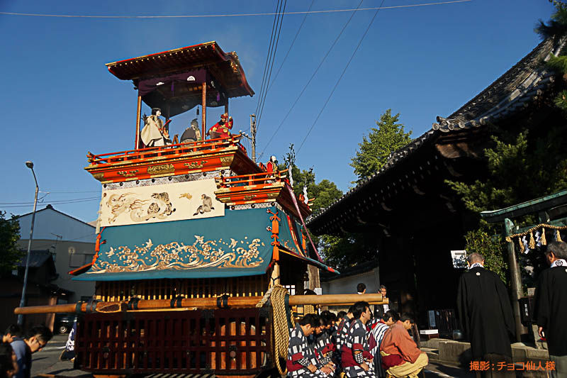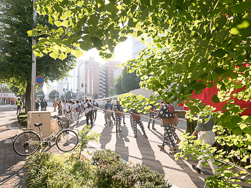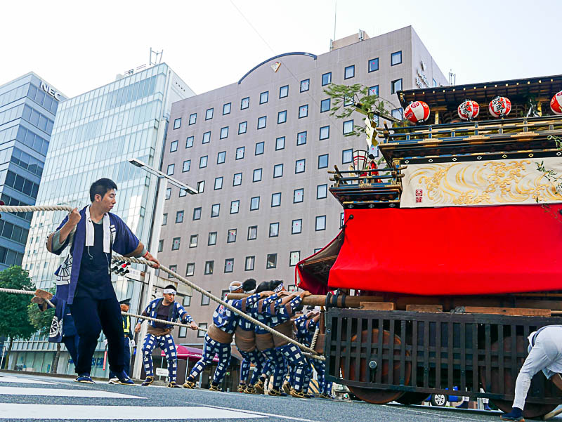 朝日を浴びて二福神車が曳かれていきます